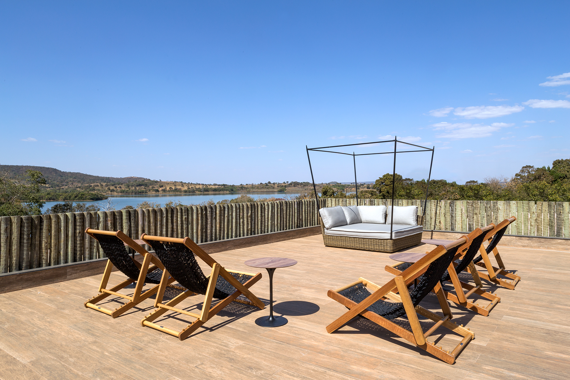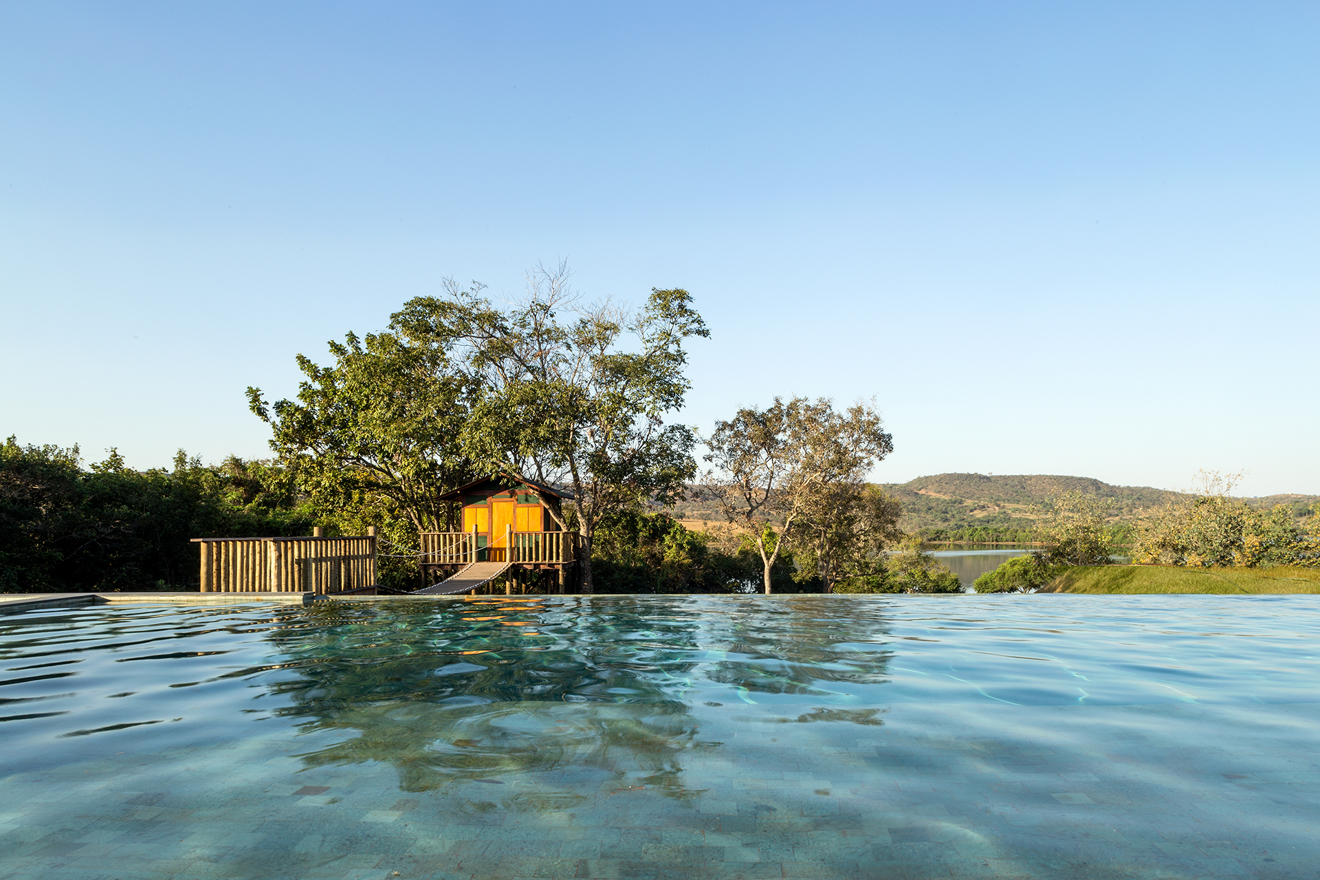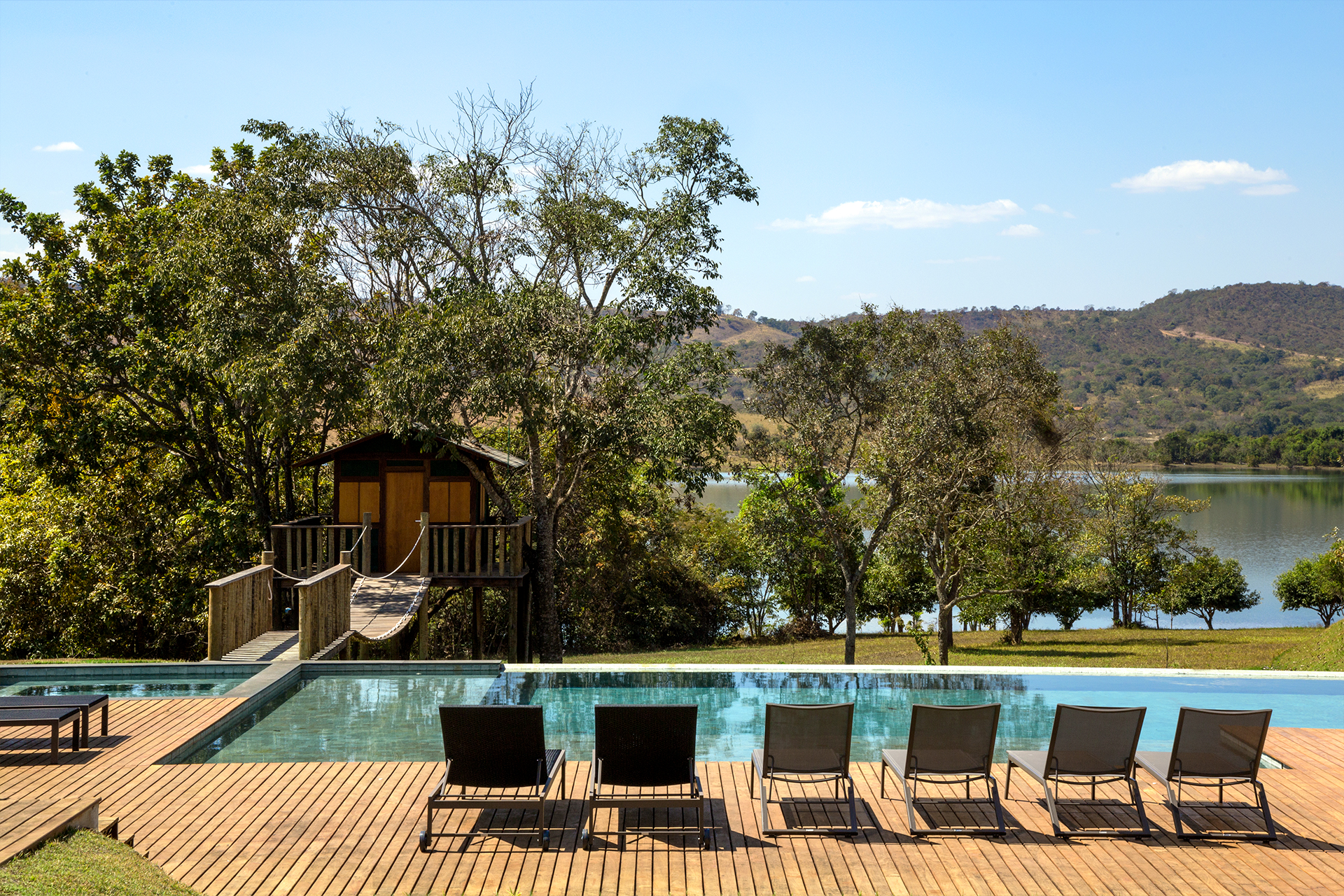 A área externa é um verdadeiro refúgio. A piscina em borda infinita mira o espelho d’água do lago, e um deck de madeira conduz à casa na árvore — elemento lúdico que ativa memórias e cria novos significados para o habitar. Ao redor, espreguiçadeiras, lounges e caminhos em pedra completam a experiência de estar em uma casa que foi pensada para acolher com simplicidade e sofisticação.