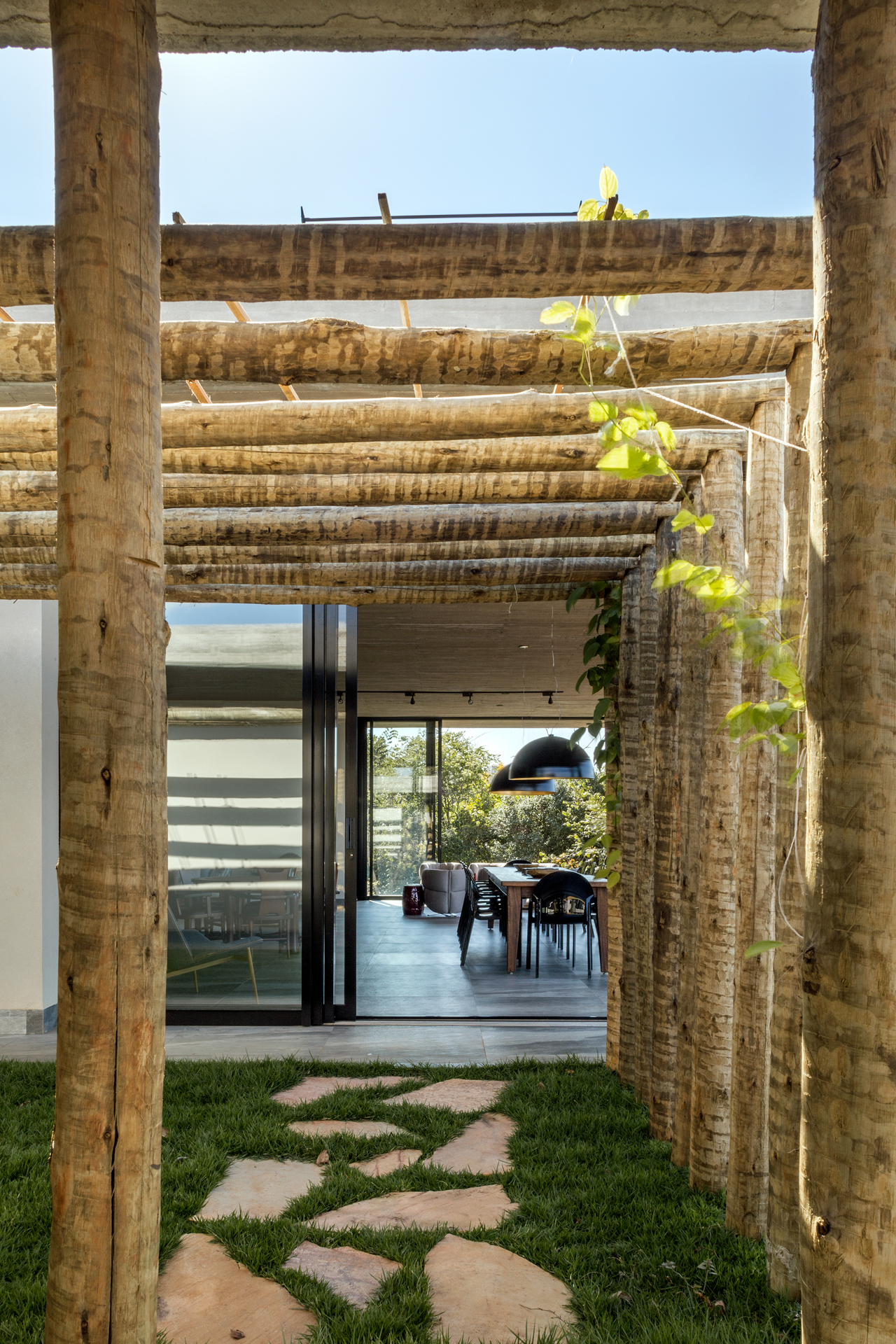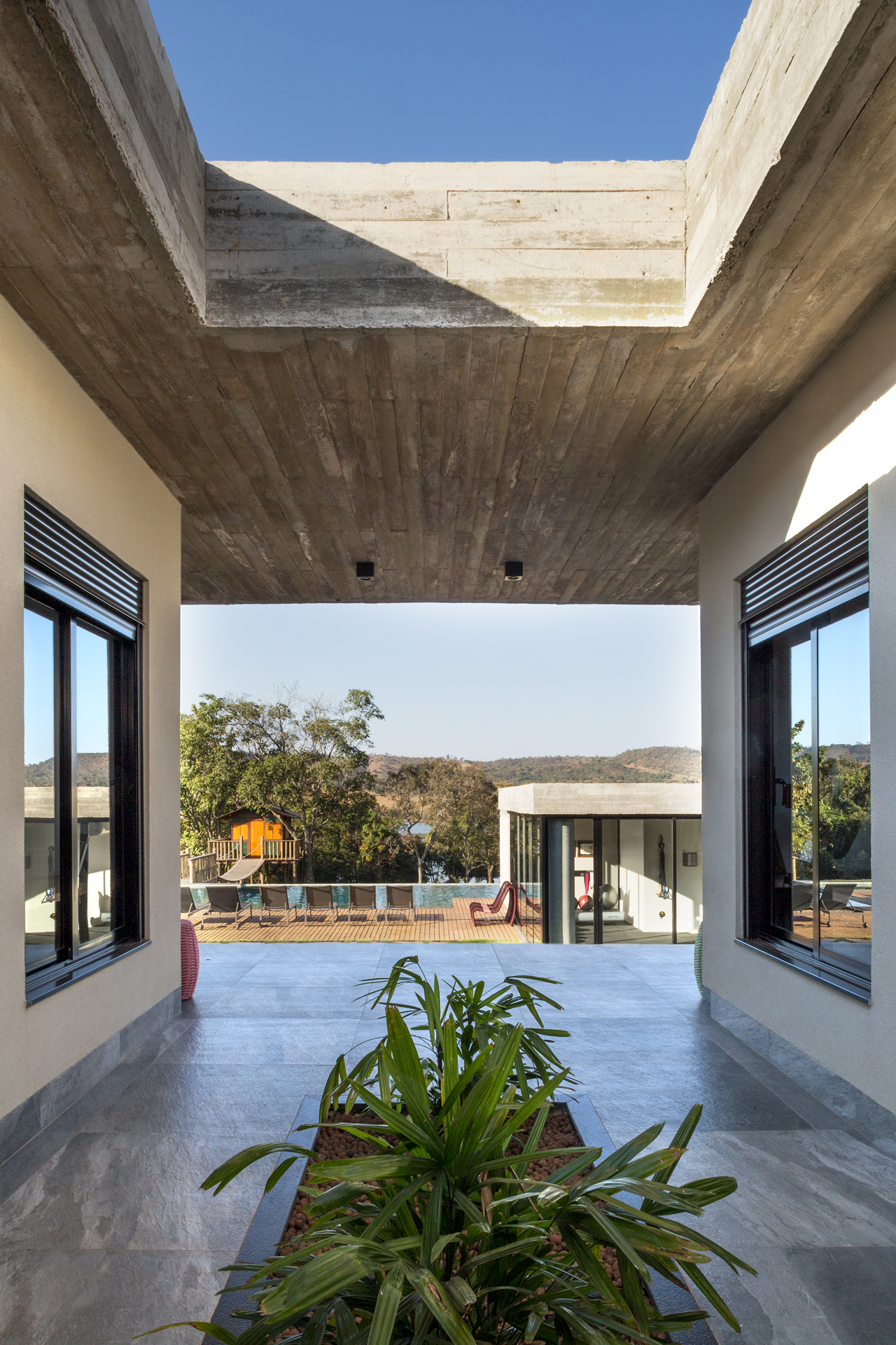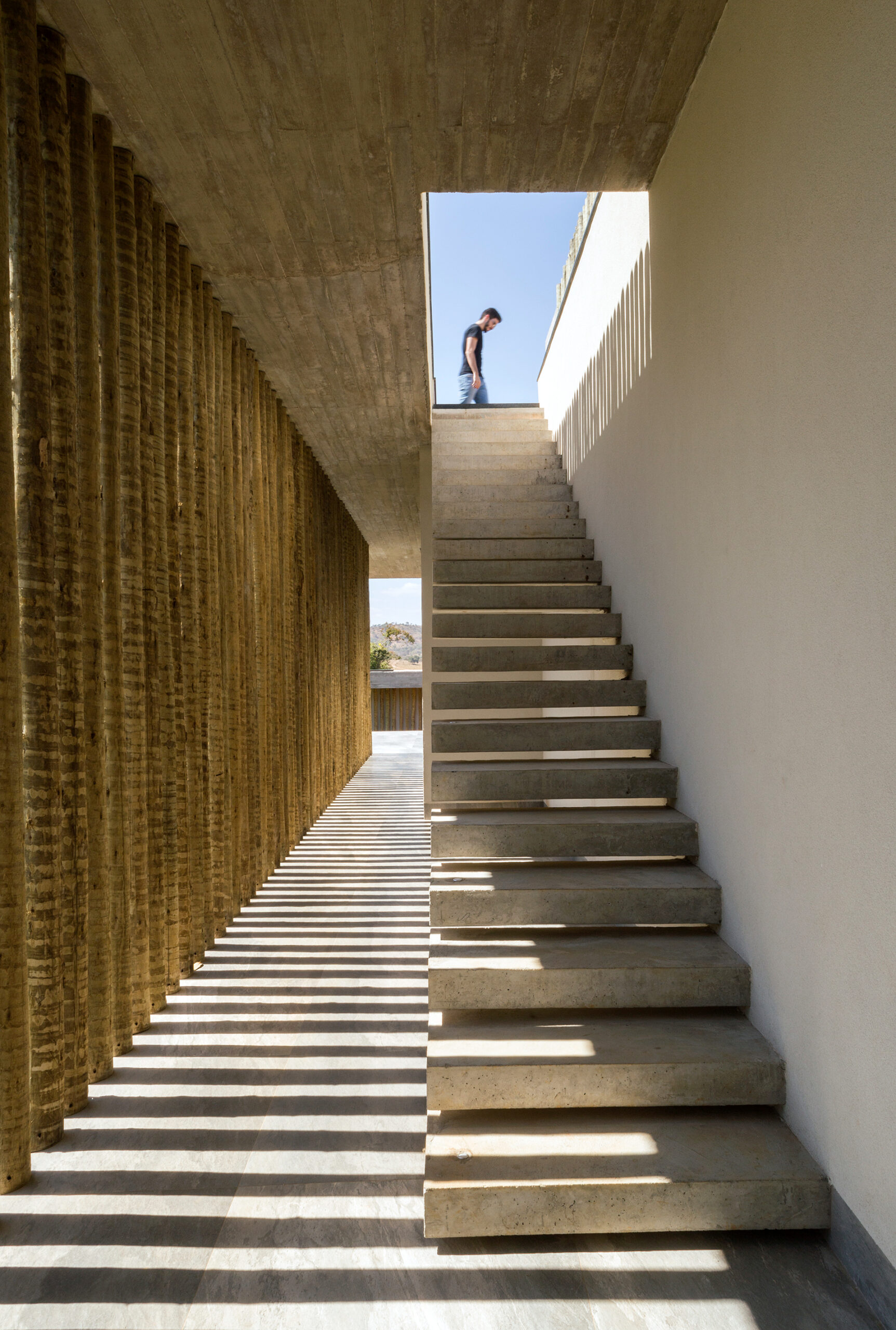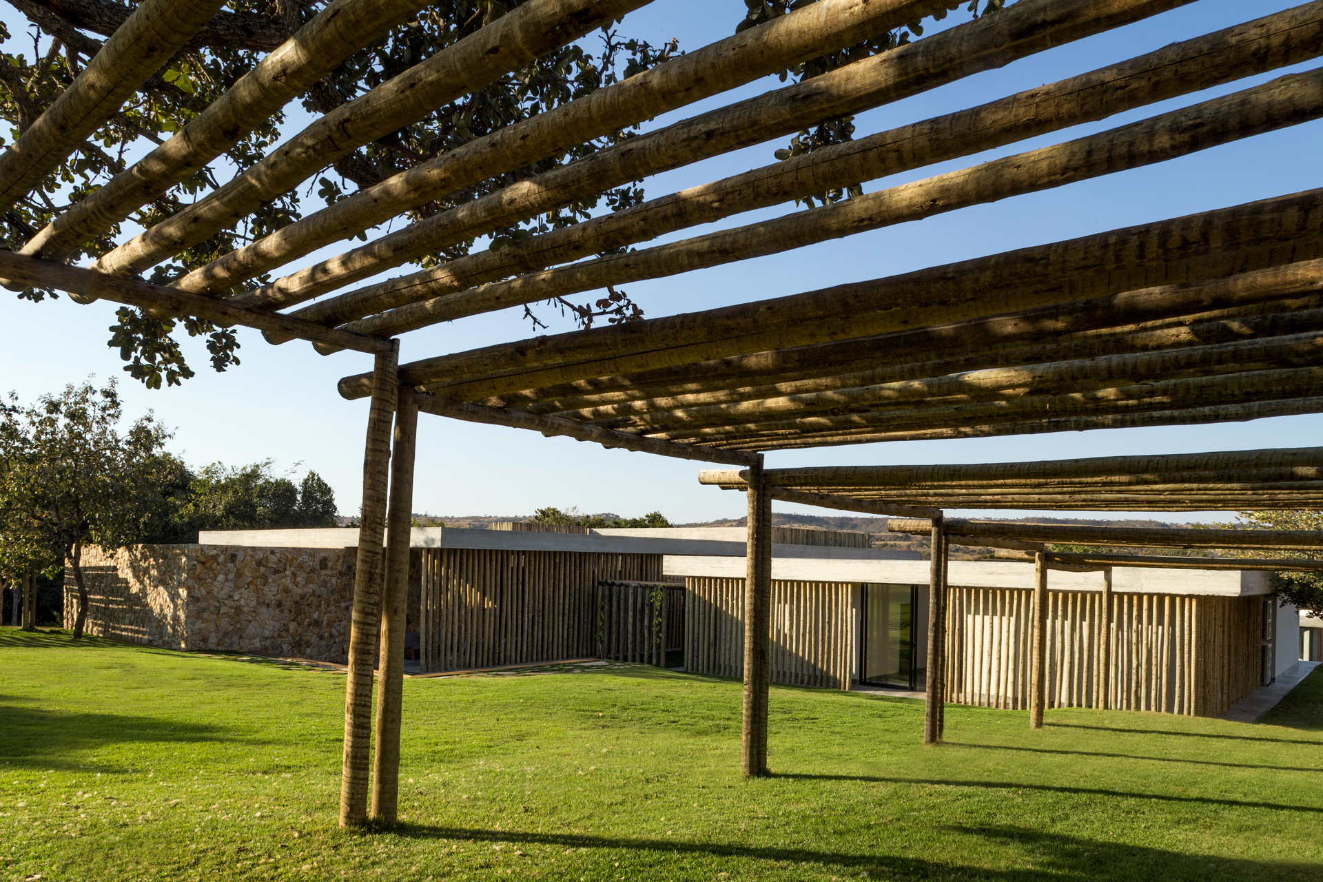 O projeto é composto por blocos interligados, que organizam a área íntima, social e de lazer de forma funcional e convidativa. Os pórticos de madeira, presentes em diferentes momentos da arquitetura, filtram a luz e criam jogos de sombra ao longo do dia, enquanto a escada escultórica e os vãos generosos reforçam a ideia de percurso e descoberta.