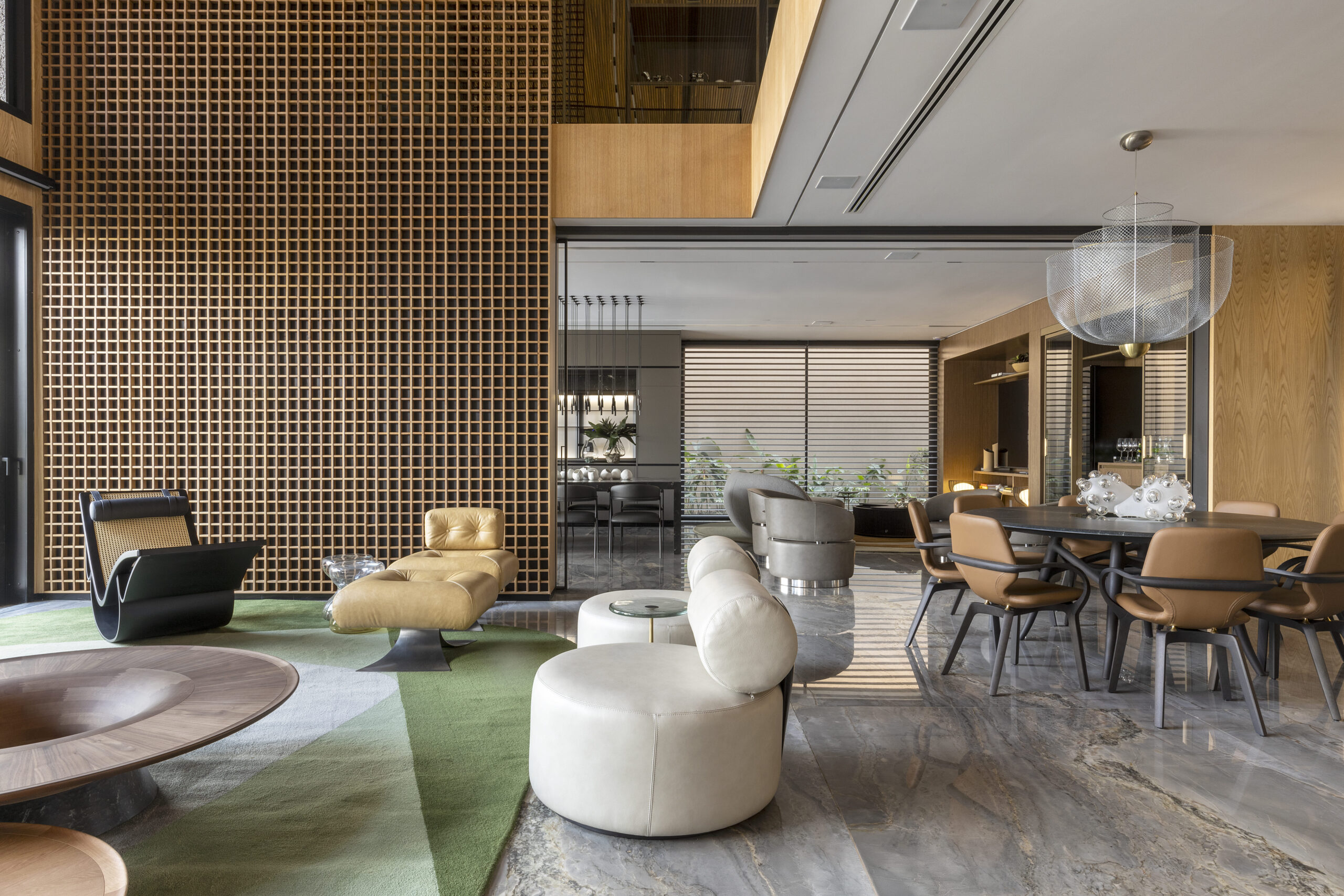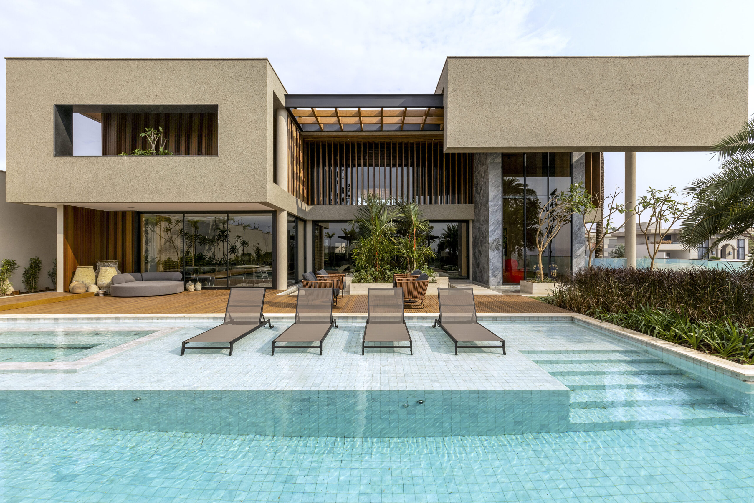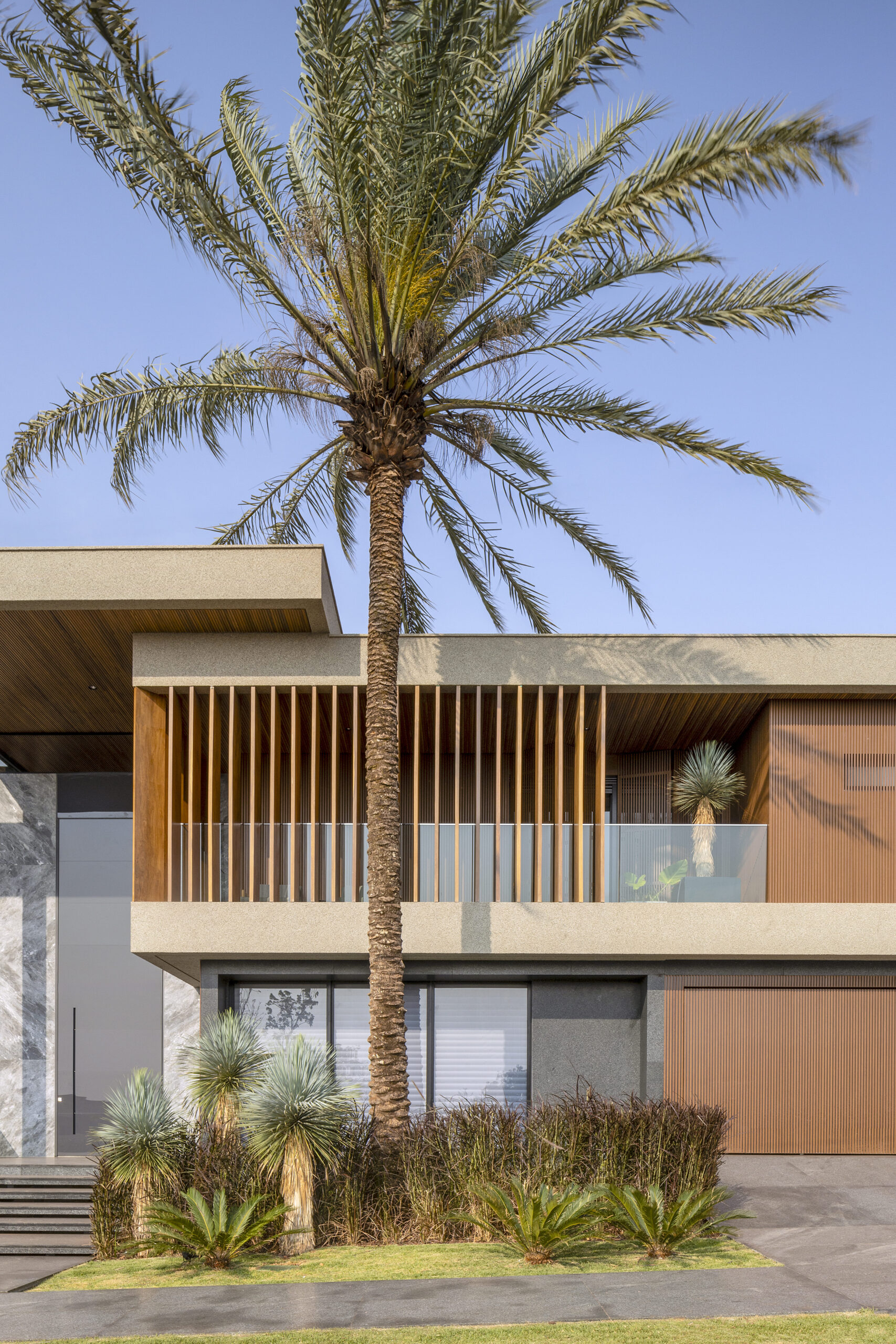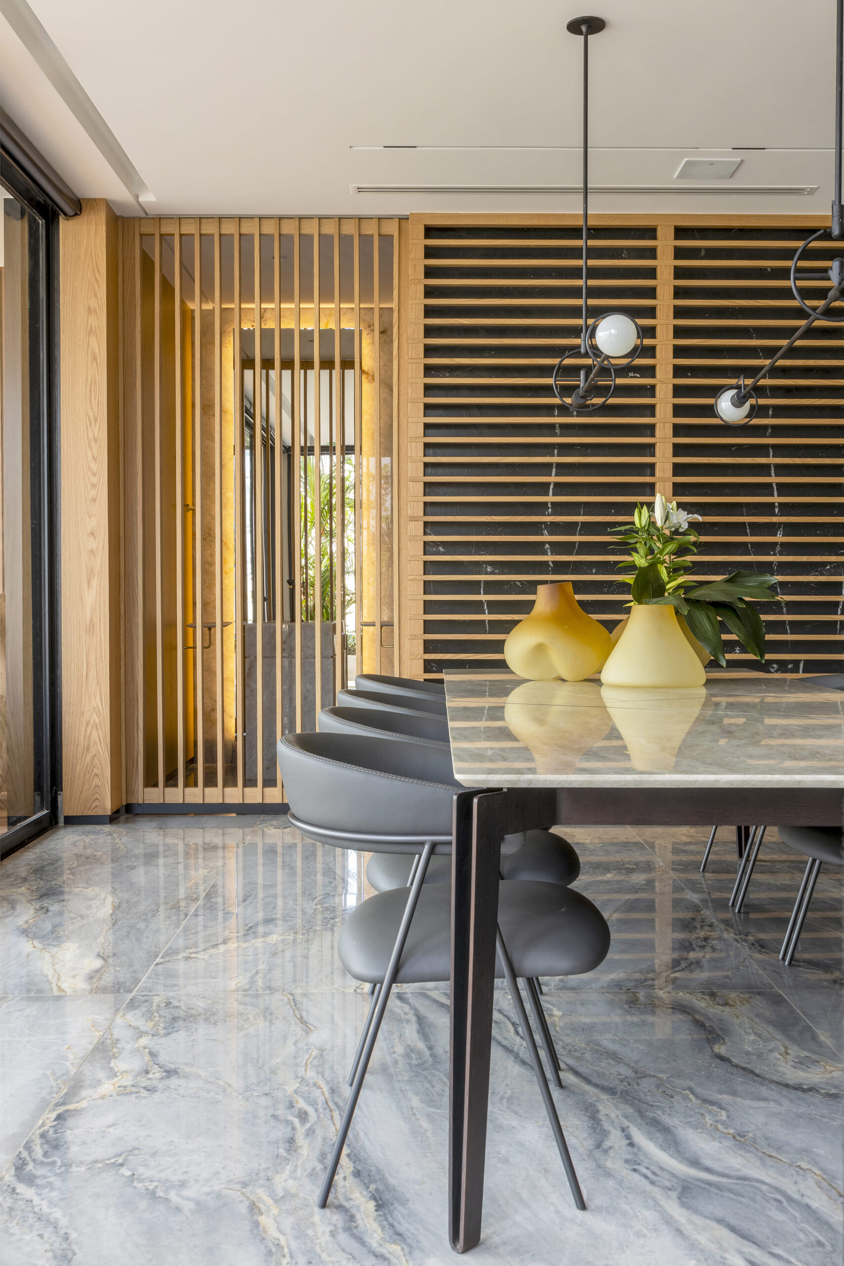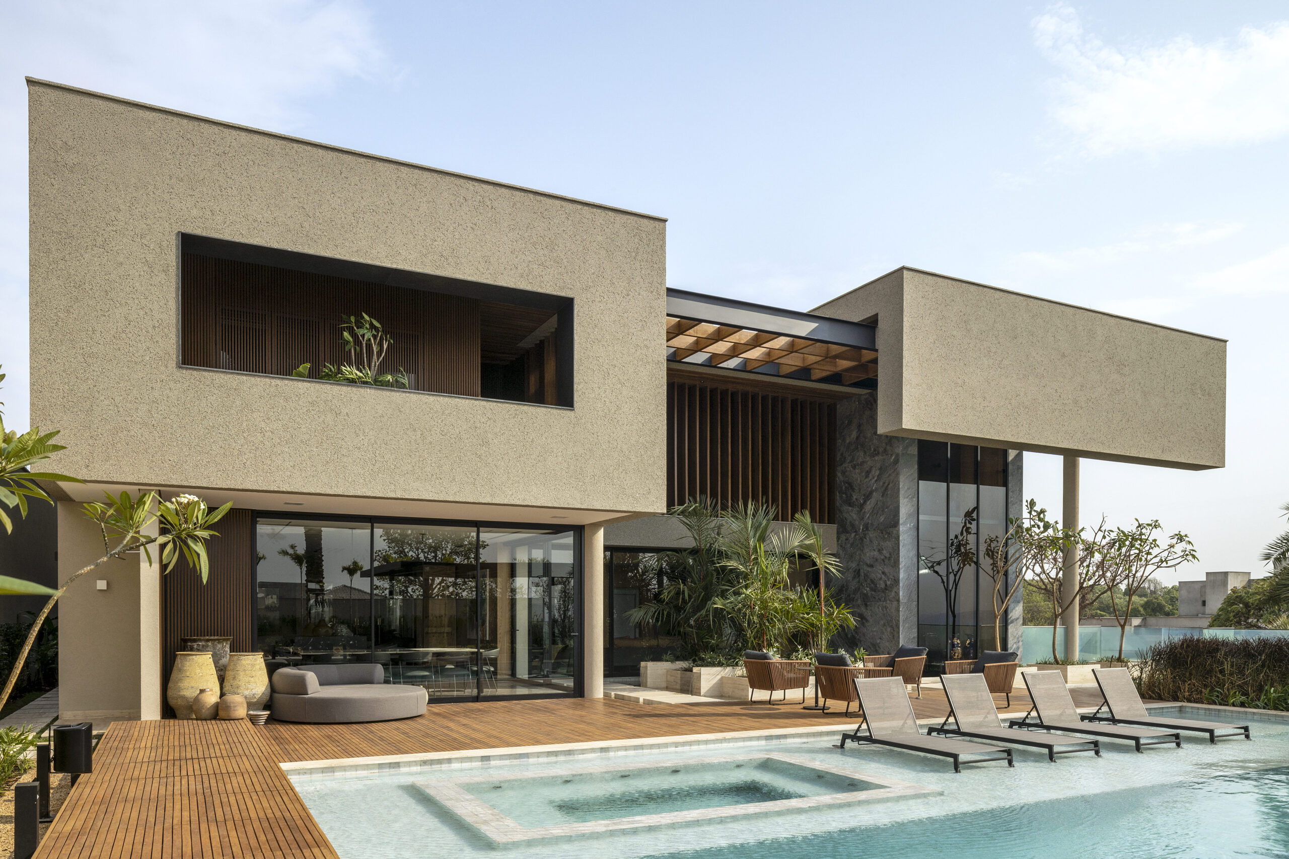 A linguagem visual da residência se expressa pela composição de planos e cheios: o ripado vertical filtra a luz e preserva a privacidade, enquanto grandes panos de vidro integram interior e exterior. O paisagismo e a piscina envolvente completam a experiência sensorial, reforçando a conexão com o entorno.