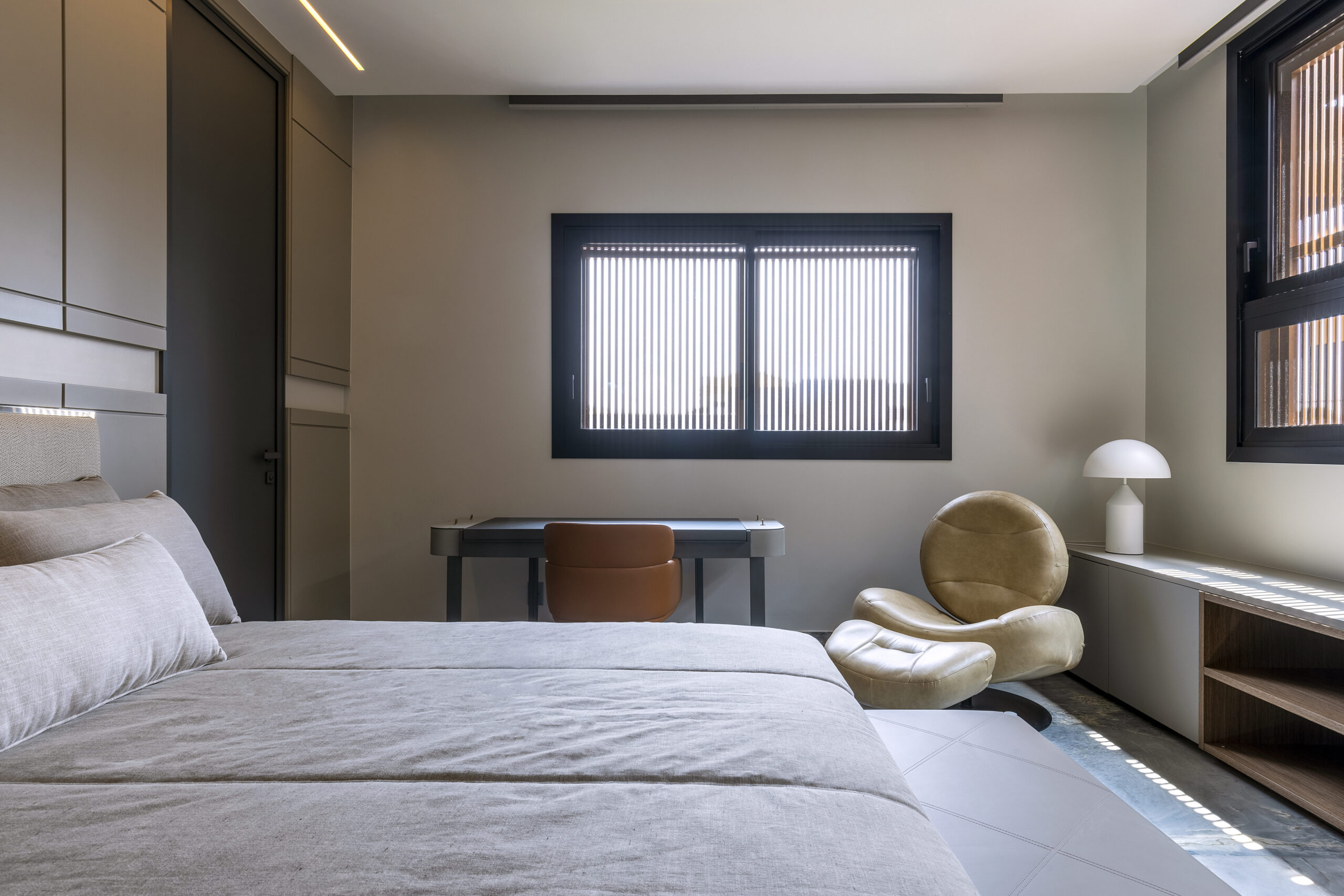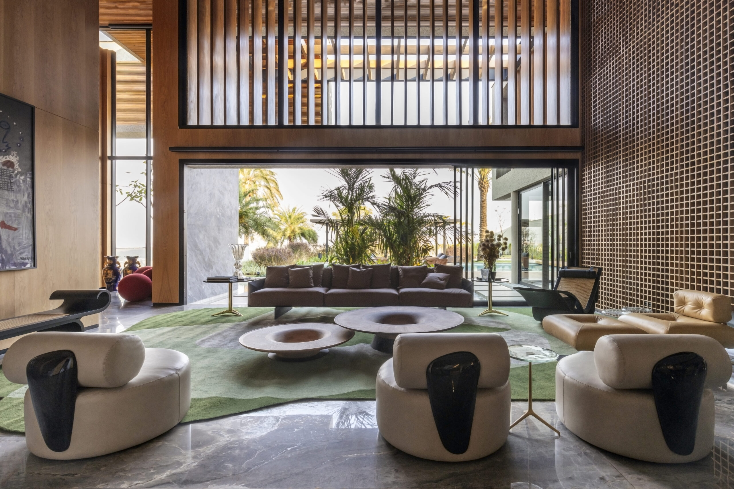 Internamente, o layout prioriza fluidez e funcionalidade, com espaços generosos e mobiliário orgânico que convidam ao relaxamento. O projeto de interiores dialoga com a arquitetura ao valorizar texturas, tons naturais e peças de design, refletindo uma elegância leve e atemporal.